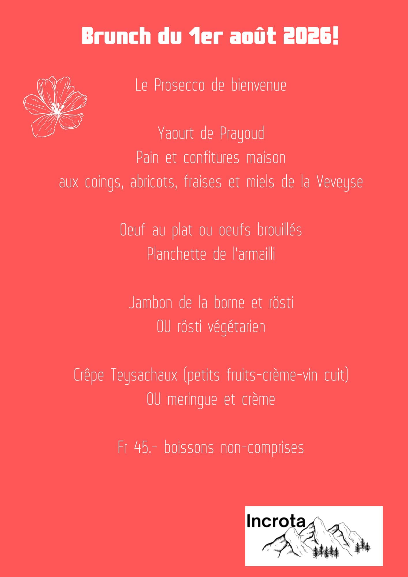 Réservations par téléphone uniquement au 076 608 75 10.